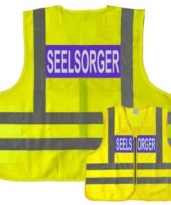 Angeboten werden hochwertige Dönges-Signalwesten, die wir mit Ihrem Wunschbegriff bedrucken. Die Warnwesten übertreffen dabei sogar die bereits hohen Mindestanforderungen des BMI (Bundesministerium des Innern und für Heimat), wodurch die Westen ein deutlich höheres Gewicht von 150g/m2 besitzen. Entsprechend genormt sind die Farbe (gelber Grundton mit Signalfeld zur Beschriftung wahlweise in gelb oder blau). Der gezeigte Begriff ist ein Beispiel, es können über den Konfigurator auch abweichende Begriffe gewählt werden.