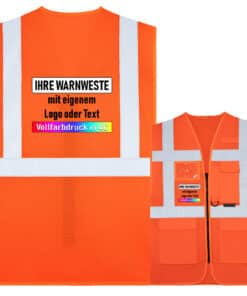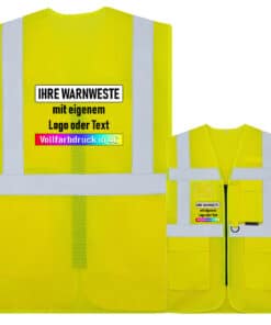 Angeboten werden hochwertige Mesh Multfunktions-Warnwesten – Larisa in vielen Farben und Größen mit Reißverschluss, mehreren Taschen, einem Ausweis-Sichtfenster und drei Leuchtstreifen. Wir bedrucken diese auf Wunsch mit Ihrem Wunschtext, Bild, Firmenname oder Logo. Egal ob für den privaten oder geschäftlichen Einsatz, ob mit Ihrem Namen, Firmenlogo, einem Vereinslogo oder einem Text-Hinweis, durch die Bedruckung lassen sich unsere Westen auf vielerlei Weisen einsetzen. Dabei bieten wir mehrere Druckarten, sodass sich auch vollfarbige Motive mit weißem Hintergrund drucken lassen. Anders als unsere regulären Warnwesten sind die angebotenen Multiwesten mit drei Leuchtstreifen ausgestattet, verfügen über einen leichtgängigen Reißverschluss, bieten eine Öse zum Anhängen von Ausrüstungsgegenständen und viel Stauraum für das Equipment ebenso wie einen Ausweis-Einschub.