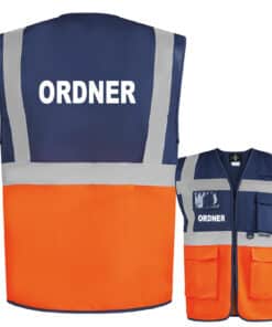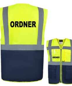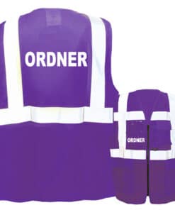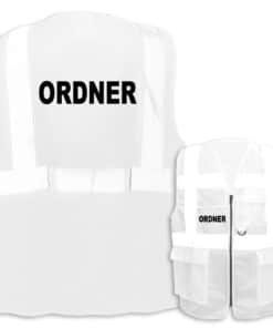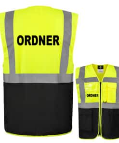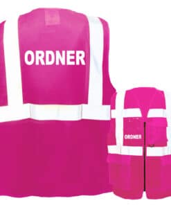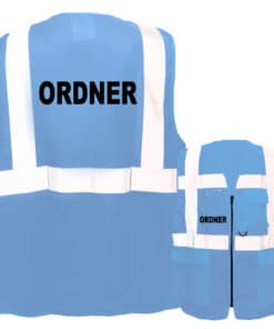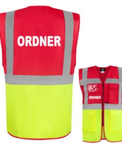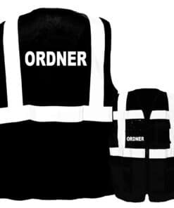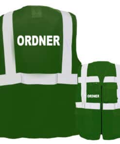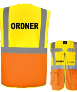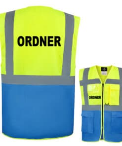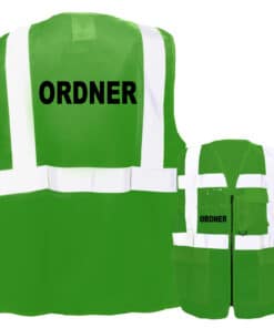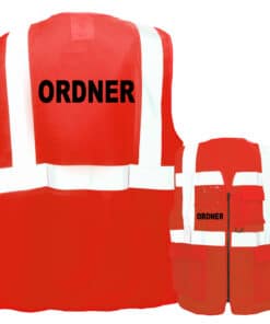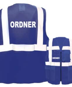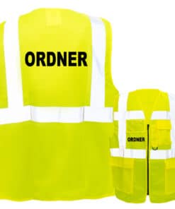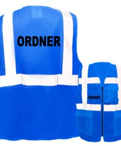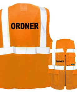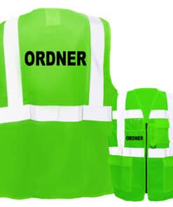 Angeboten werden hochwertige Multifunktions-Warnwesten mit Aufdruck Ordner in vielen Farben und Größen mit Reißverschluss, mehreren Taschen, einem Ausweis-Sichtfenster und drei Leuchtstreifen. Bedruckt sind die Westen mit dem Begriff Security – es können aber über den Konfigurator auch abweichende Begriffe gewählt werden, ebenso wie bspw. ein Firmenname addiert werden kann.