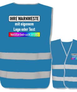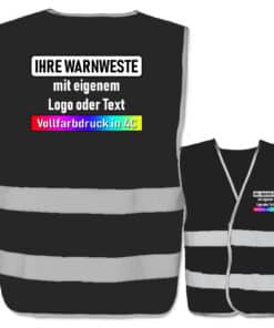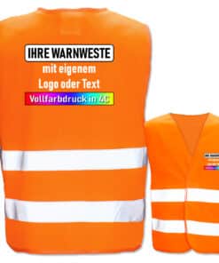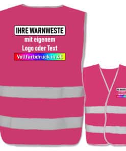 Warnwesten mit zwei Leuchtstreifen und Klettverschluss sowie eine große Auswahl an Farben und Größen. Der Druck erfolgt in schwarzer Farbe per extrem widerstandsfähigen Sublimationsverfahren.