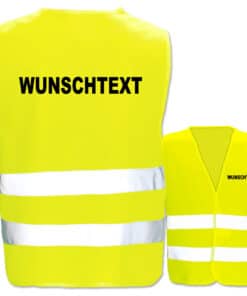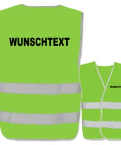 Testexport Wunschtext-Warnwesten mit zwei Leuchtstreifen und Klettverschluss sowie eine große Auswahl an Farben und Größen. Der Druck erfolgt in schwarzer Farbe per extrem widerstandsfähigen Sublimationsverfahren.